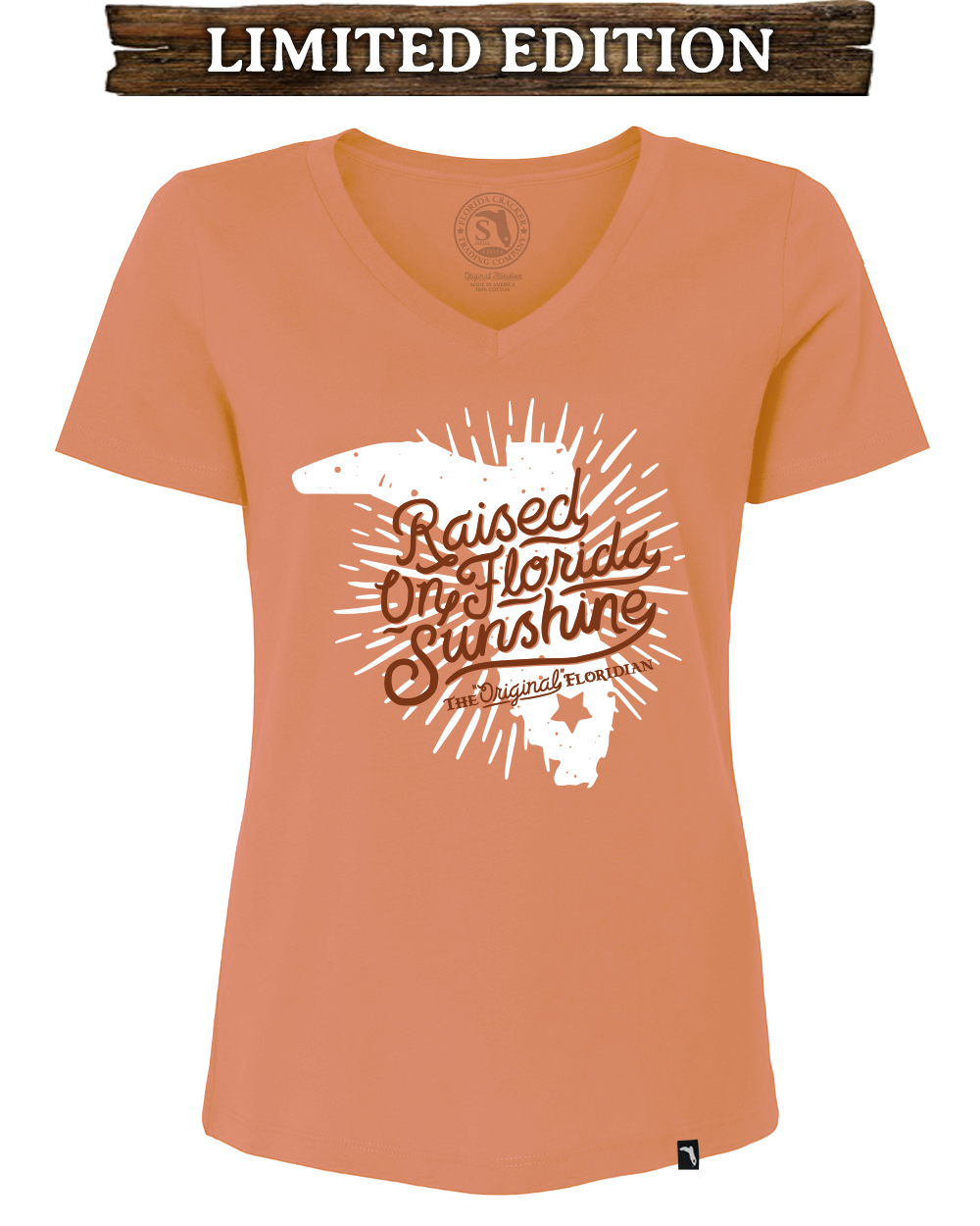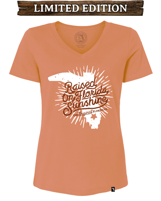 The raised on Florida sunshine design on this light orange v-neck adds a touch of southern charm to any outfit. Experience the warmth and joy of the Sunshine State with this must-have V-neck.