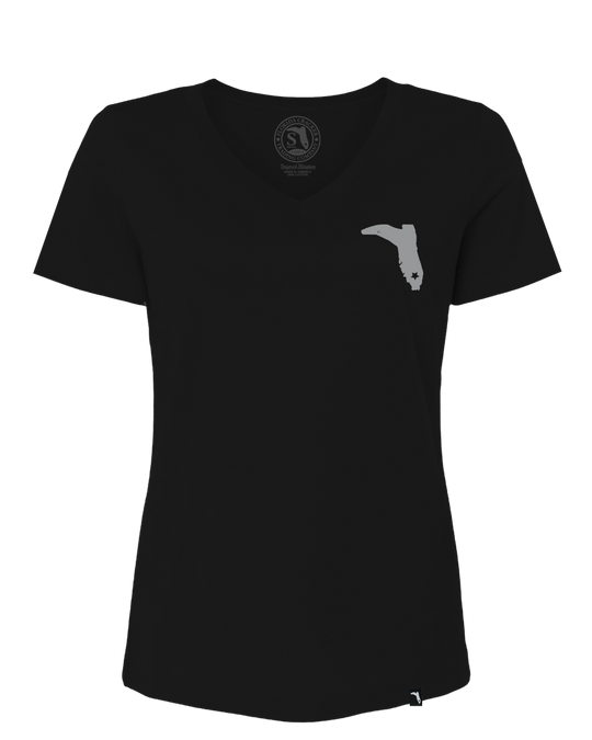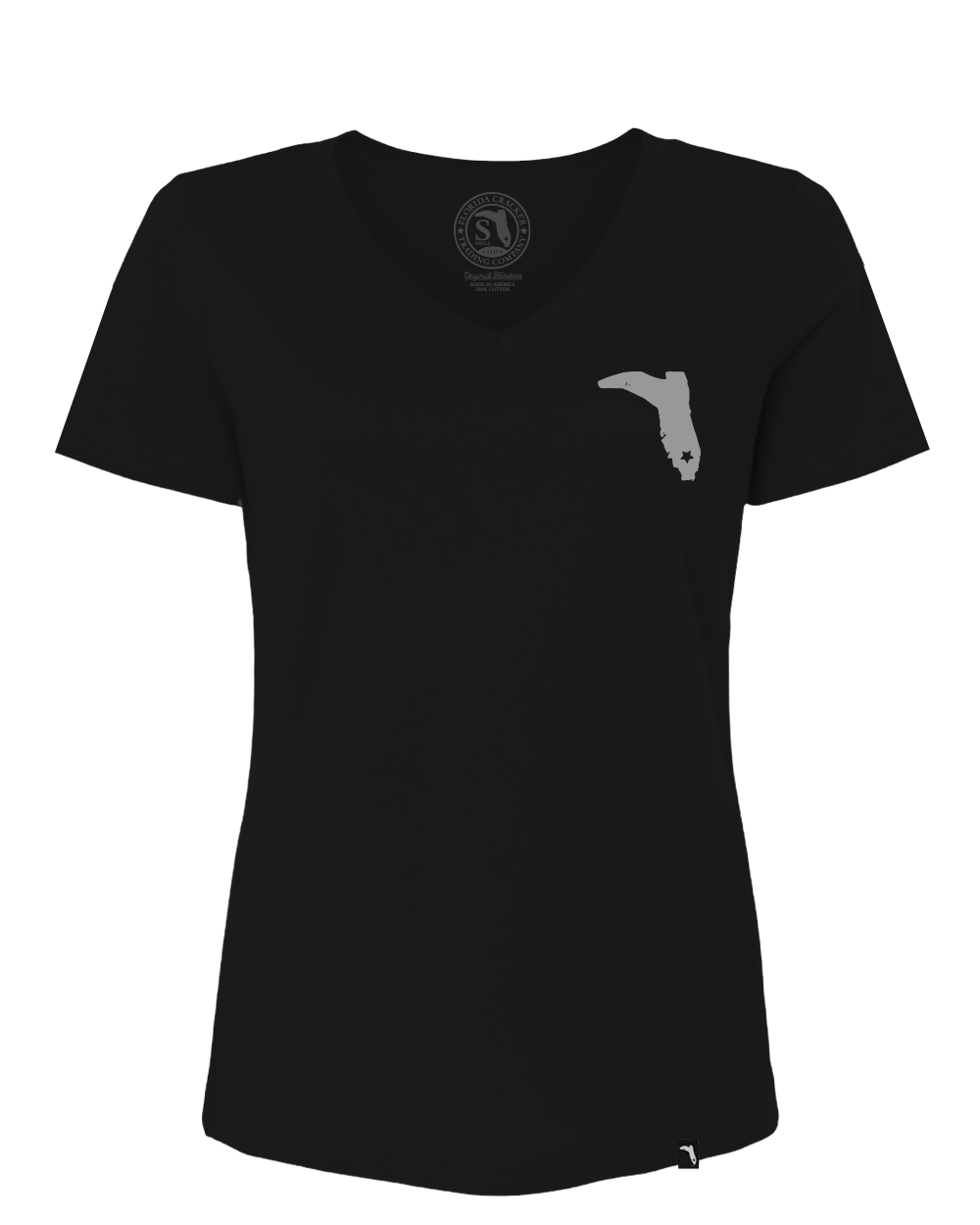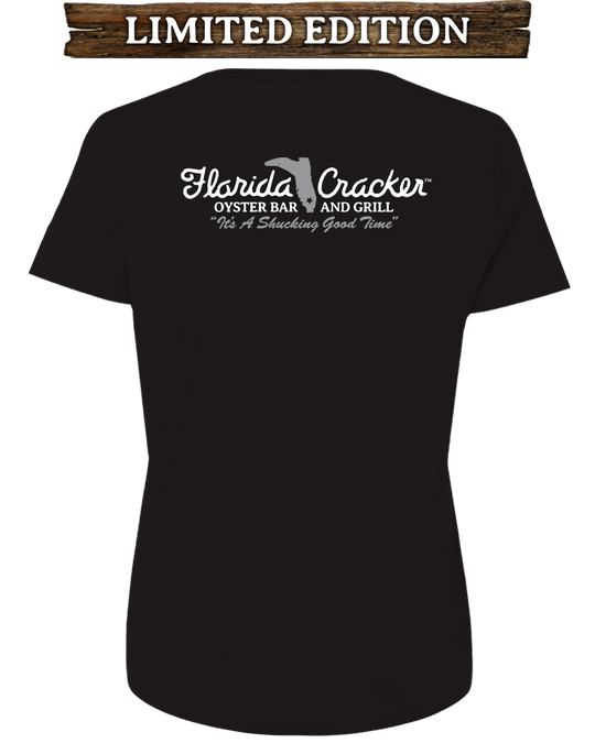 This black v-neck sports the Florida Cracker Oyster Bar & Grill logo with the slogan "For a Shuckin' Good Time" in light grey and white on the back and the famous Florida boot logo on the front left chest in light grey.