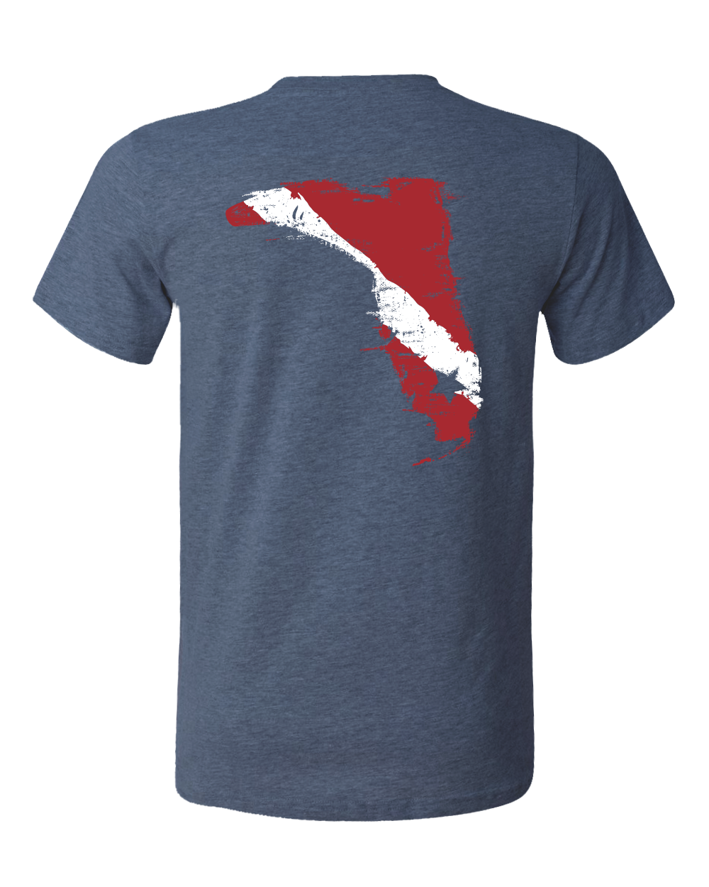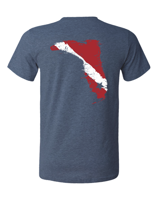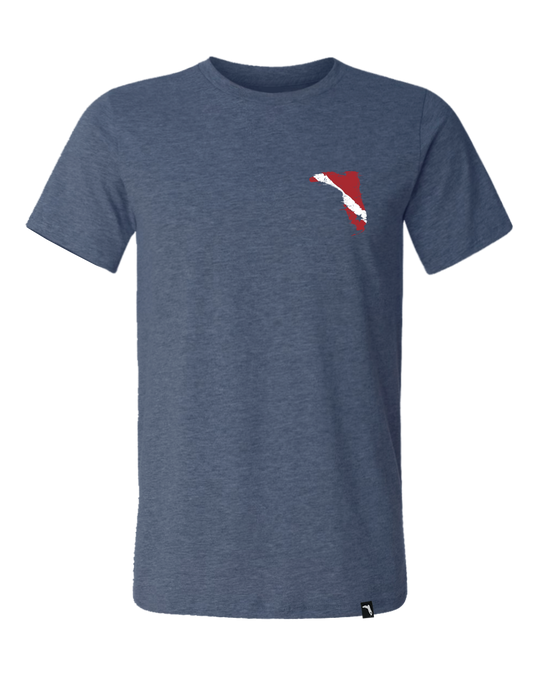 This shirt has our distressed Florida Boot logo designed with a red and white divers flag on the back and on the front left chest. The color of the shirt is a nice navy heather.