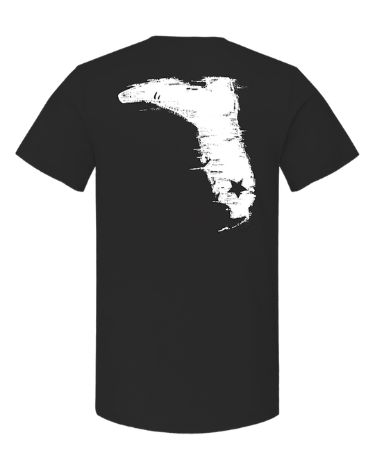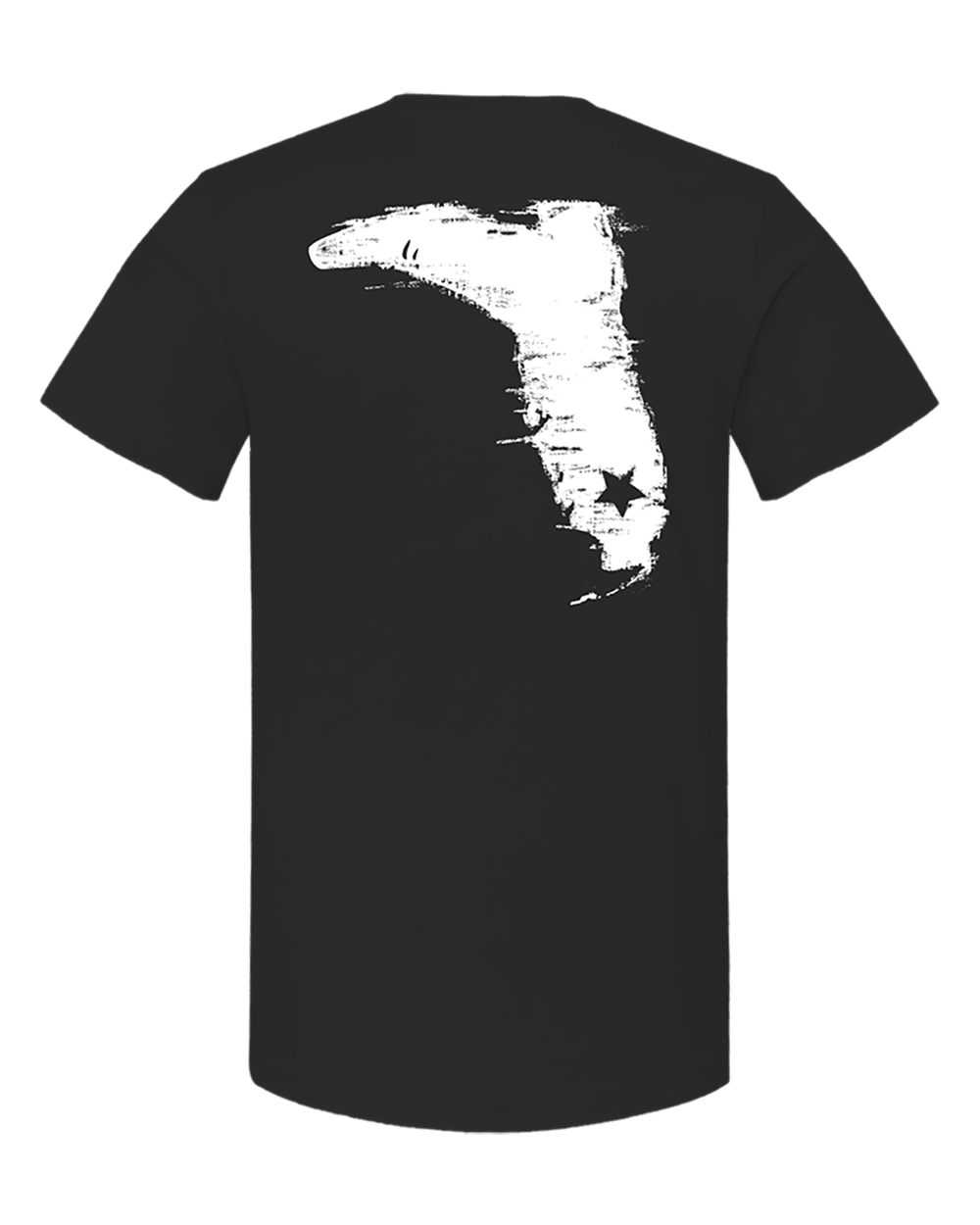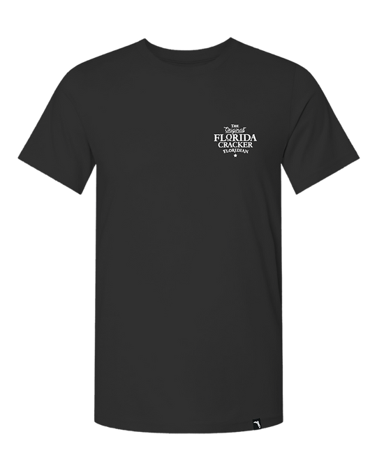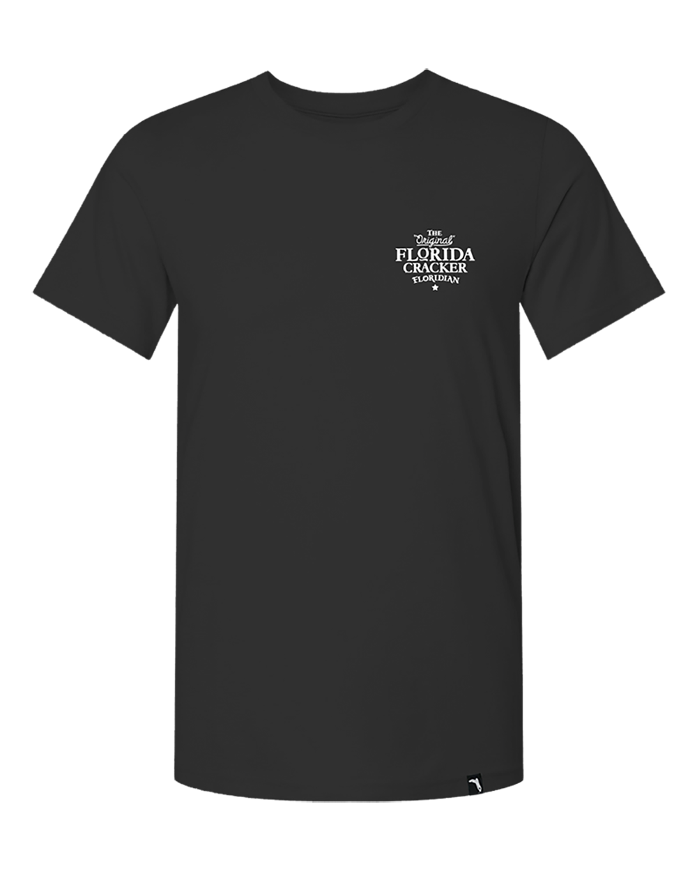 Florida Cracker distressed boot logo in white on a solid black short-sleeved tee. Front left chest has "The Original Floridian" logo in white.