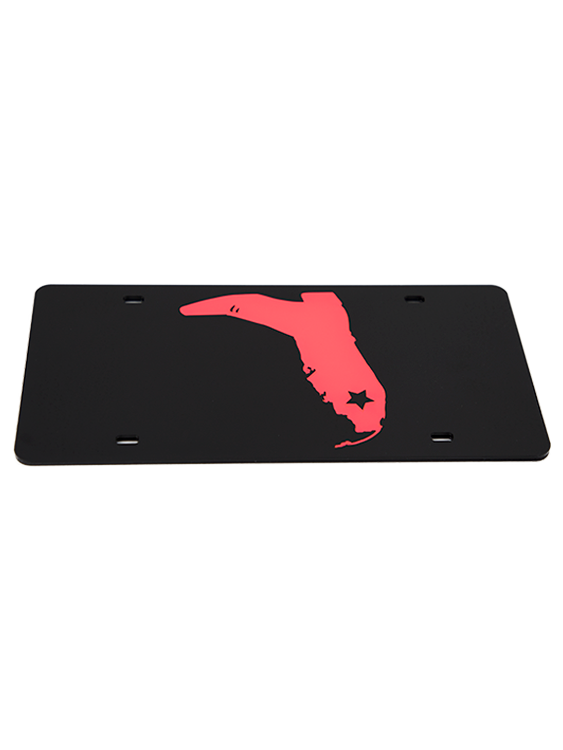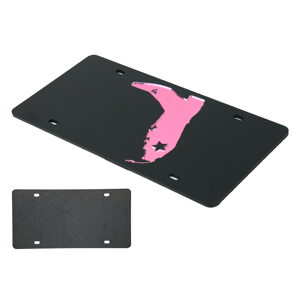Florida Cracker black acrylic license plate with mirrored pink famous boot logo.