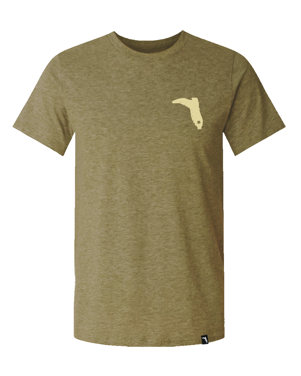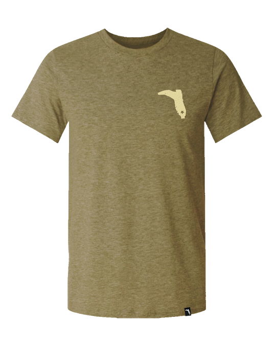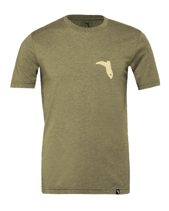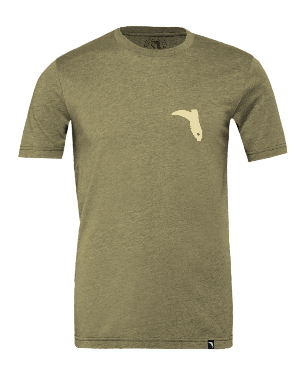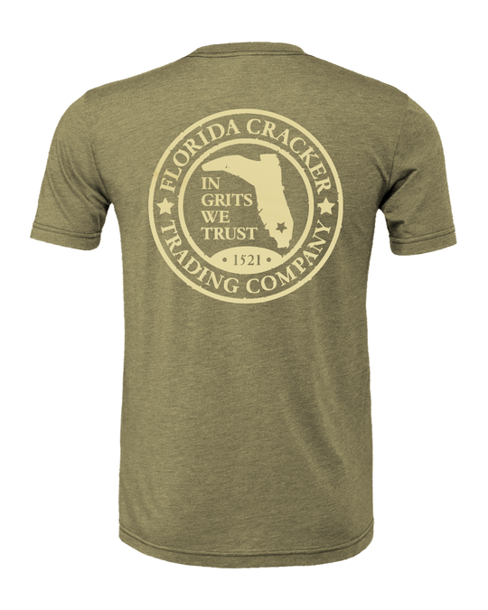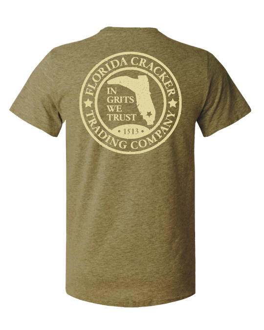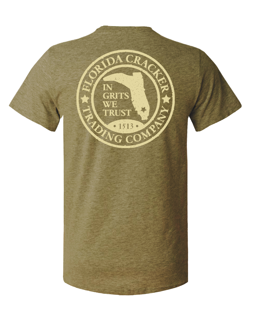 Florida Cracker Original Badge Logo in tan on an Olive Heather tee.