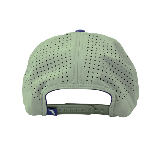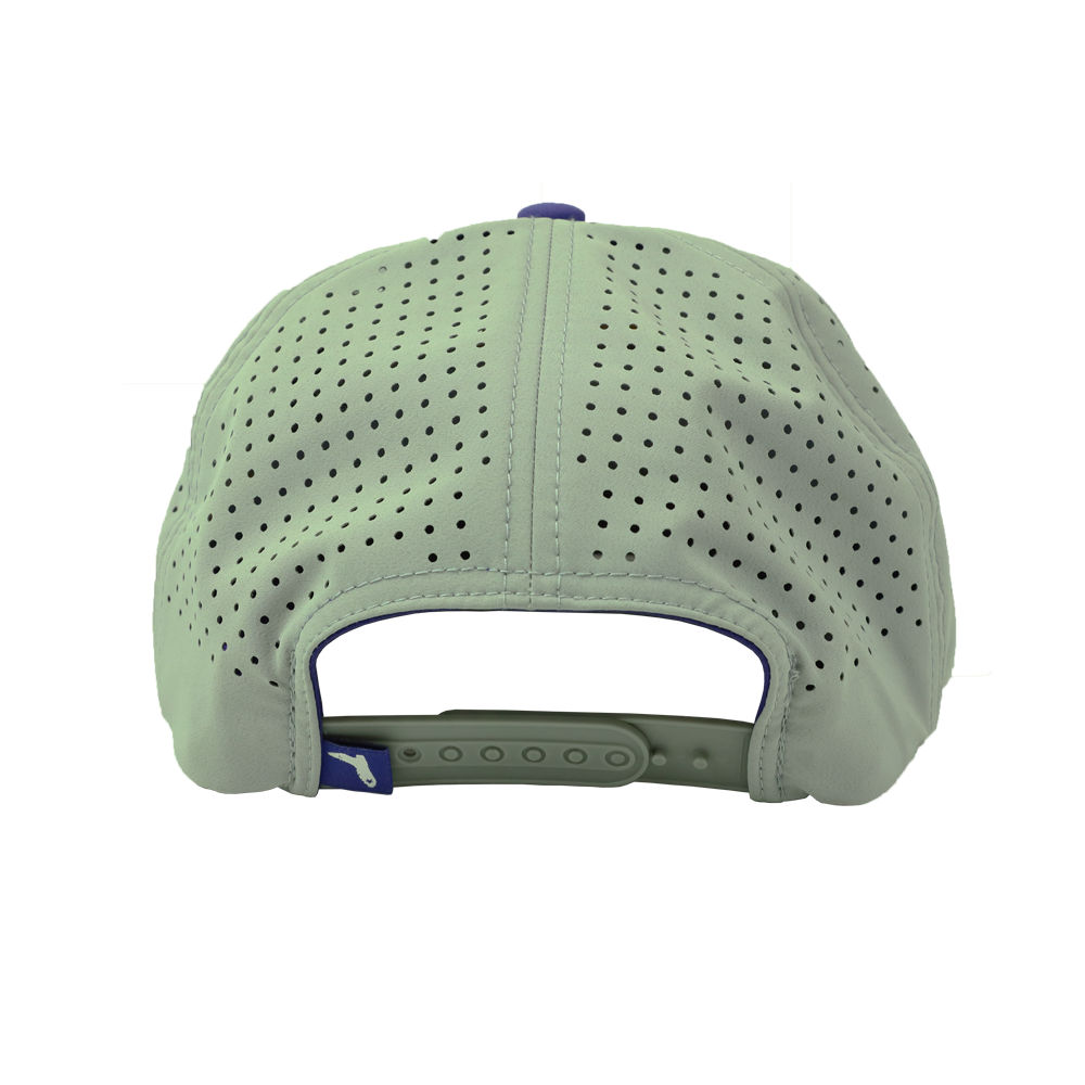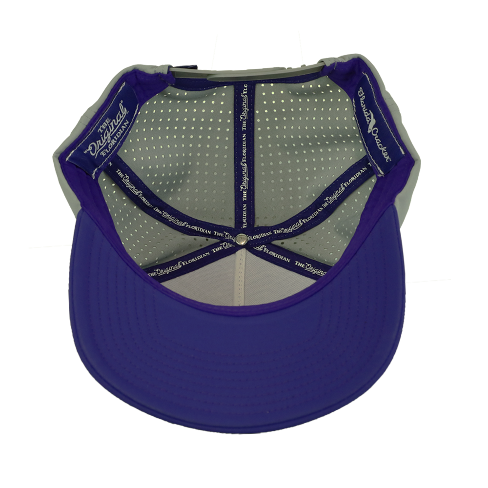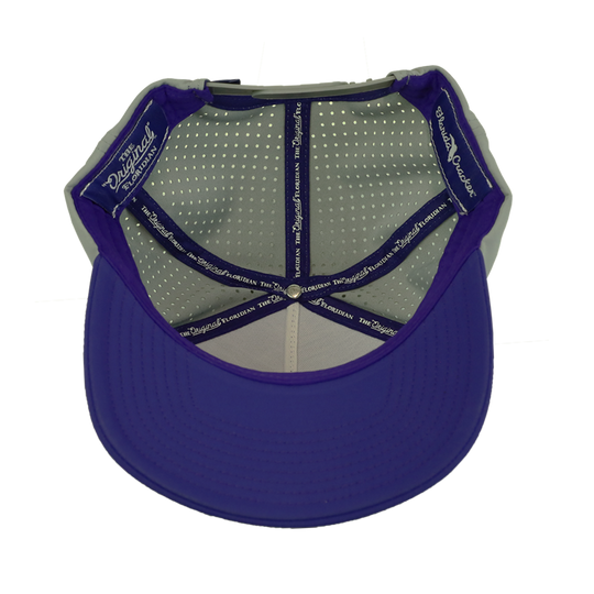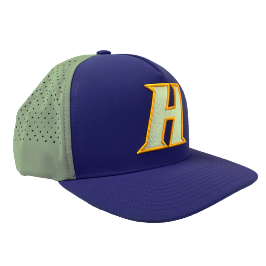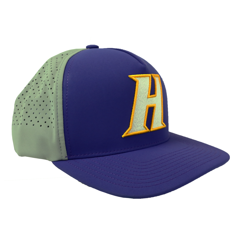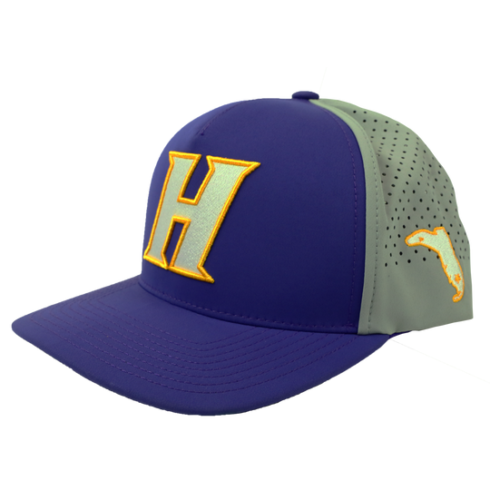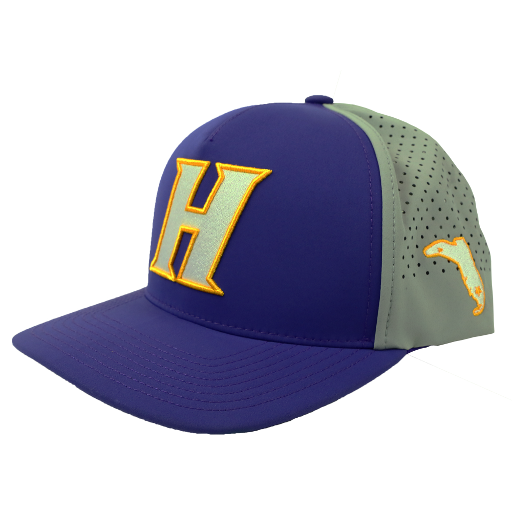 Purple/Charcoal six panel flat bill hat with solid front and perforated cloth back. Adjustable one-size fits all design sporting the Hernando High School logo in Silver and Gold embroidered on the front. The Florida Cracker Boot logo is embroidered on the left side in the same colors as the HHS logo to match and a purple tag on the back with a white boot logo is also present.