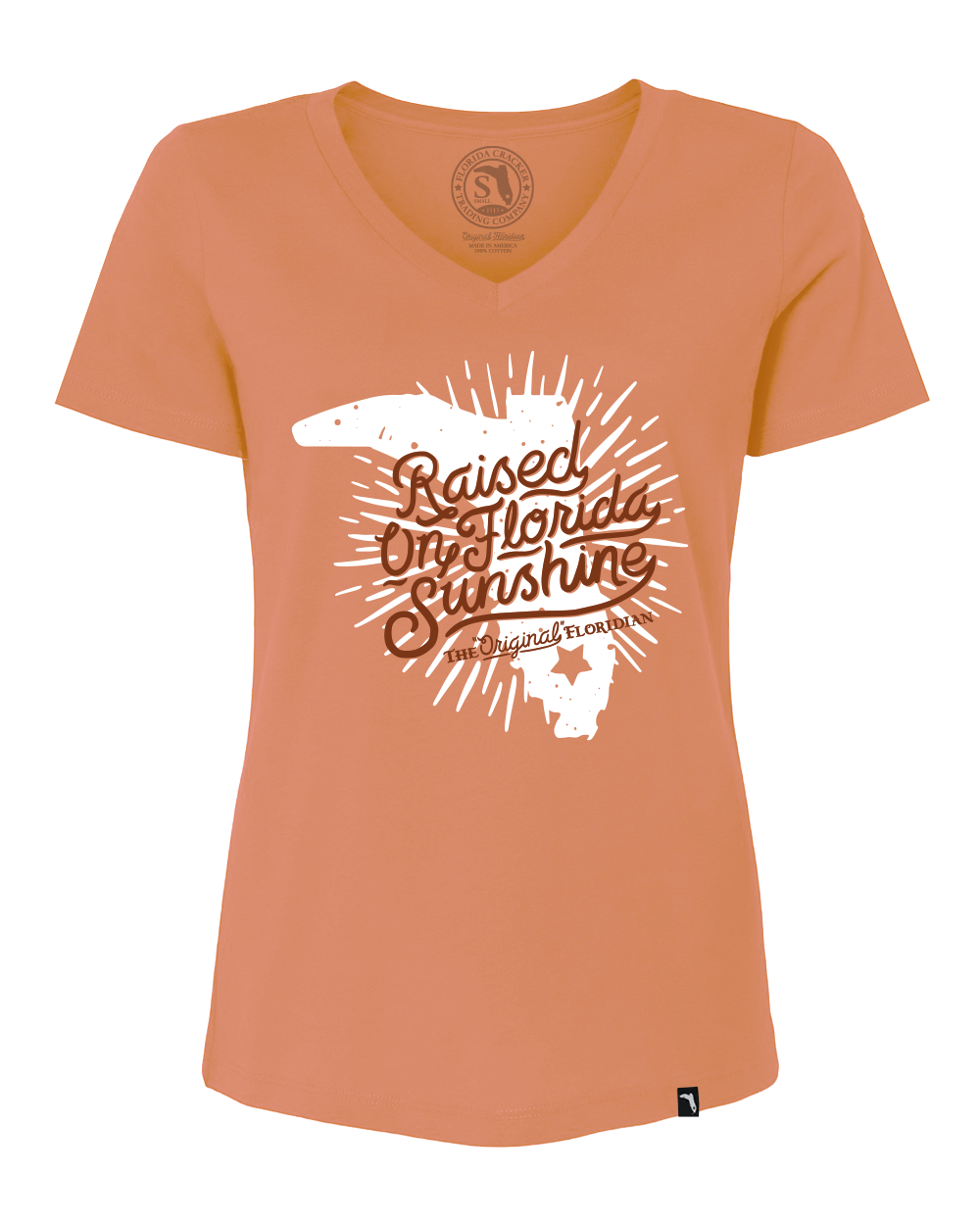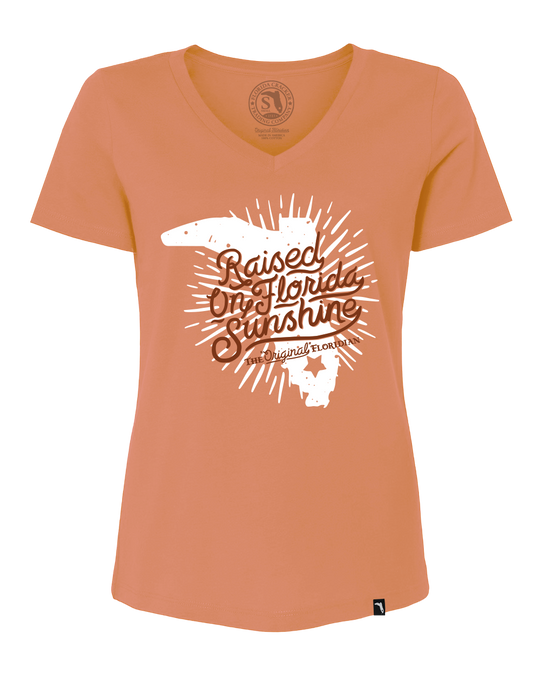 The raised on Florida sunshine design on this light orange v-neck adds a touch of southern charm to any outfit. Experience the warmth and joy of the Sunshine State with this must-have V-neck.