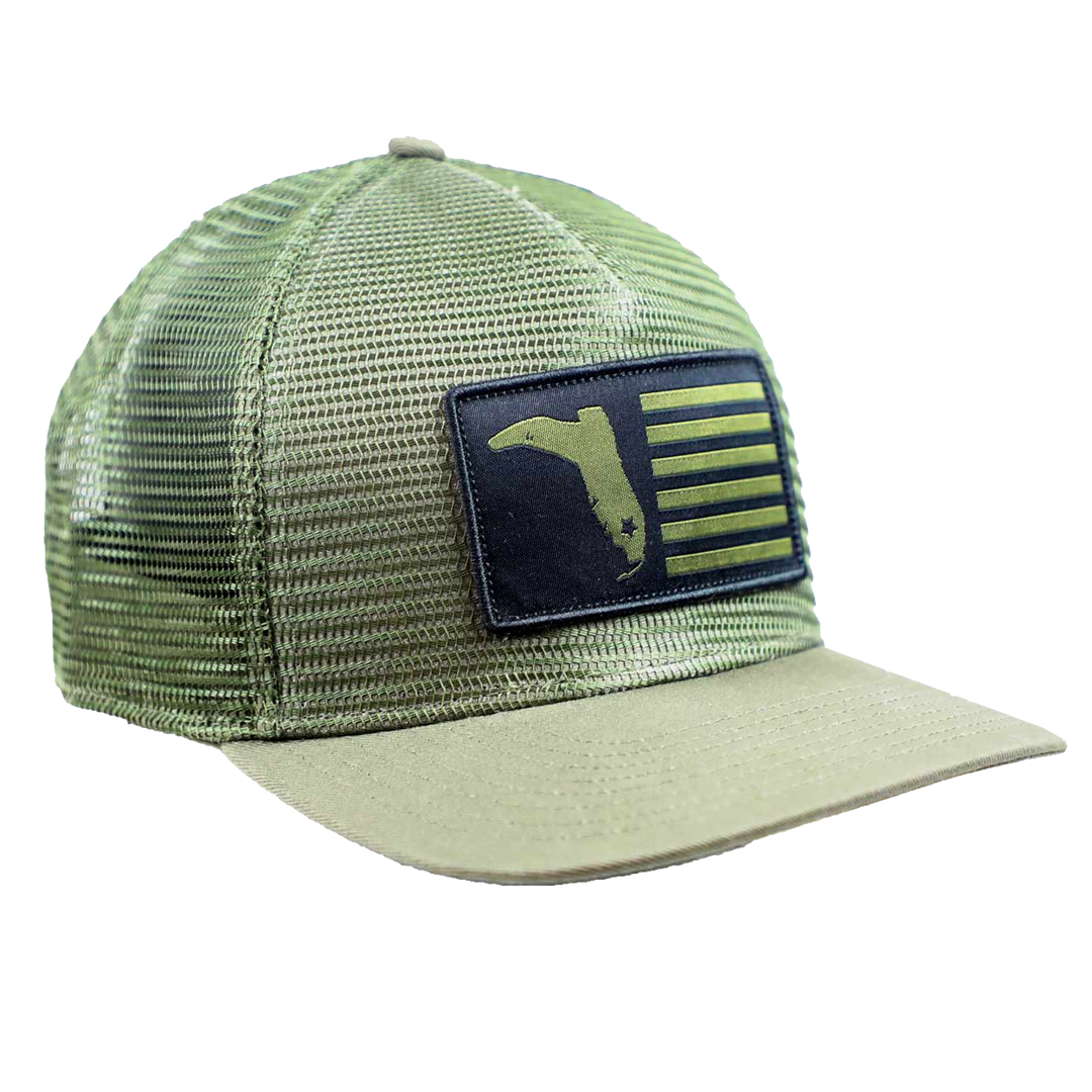 Loden mesh overlay trucker style hat with black monochromatic boot flag patch.