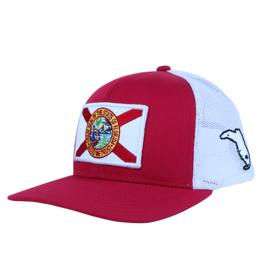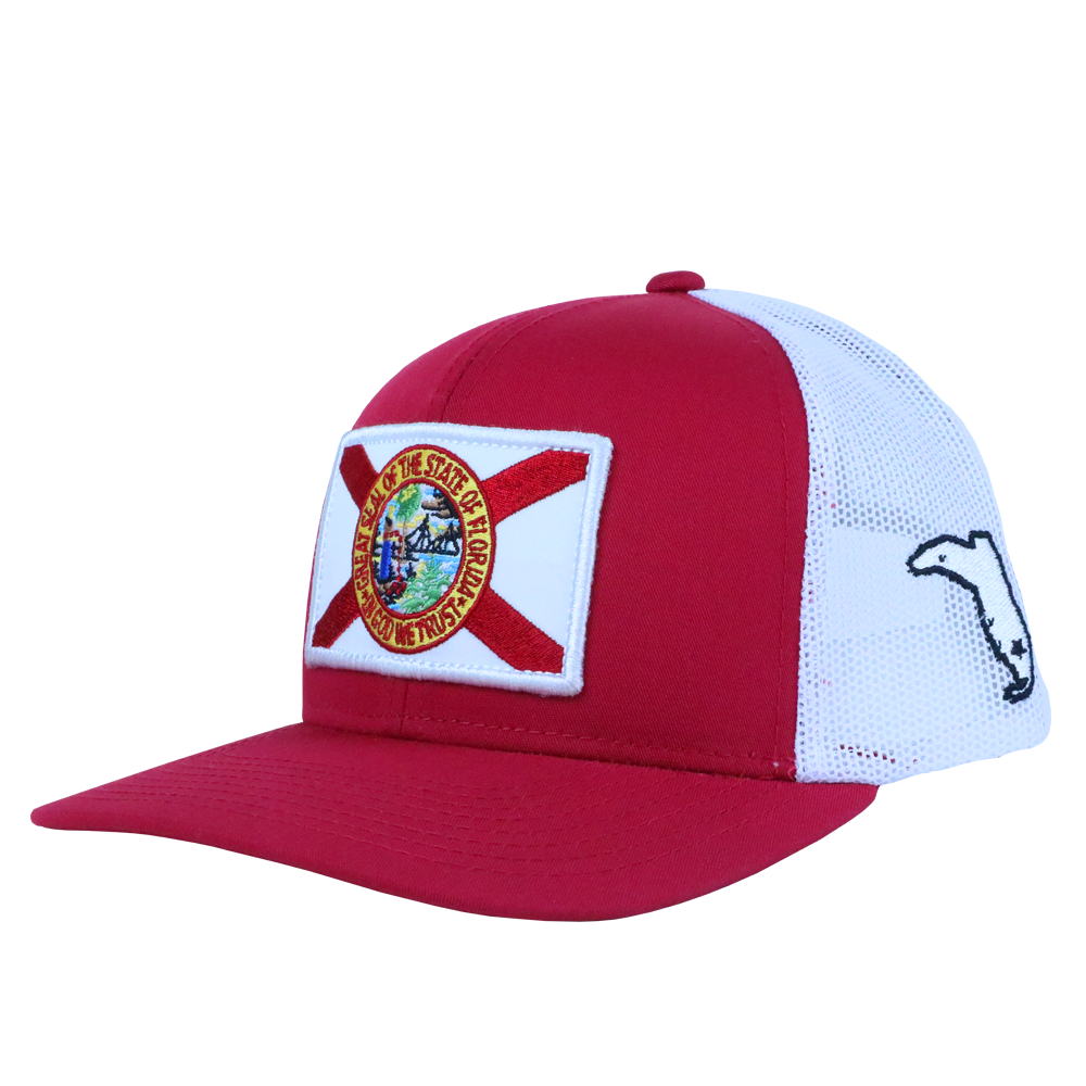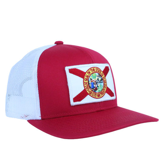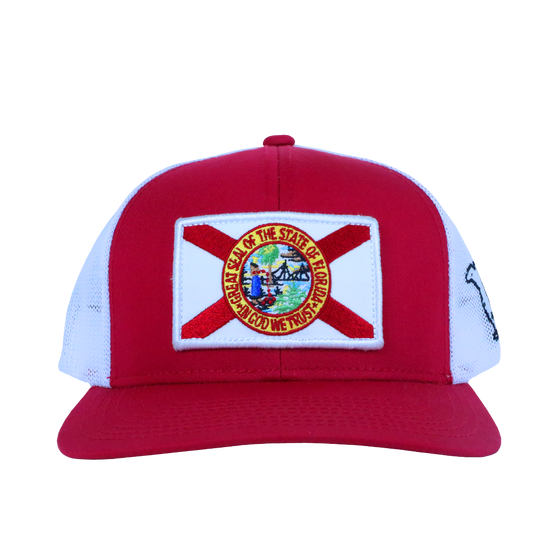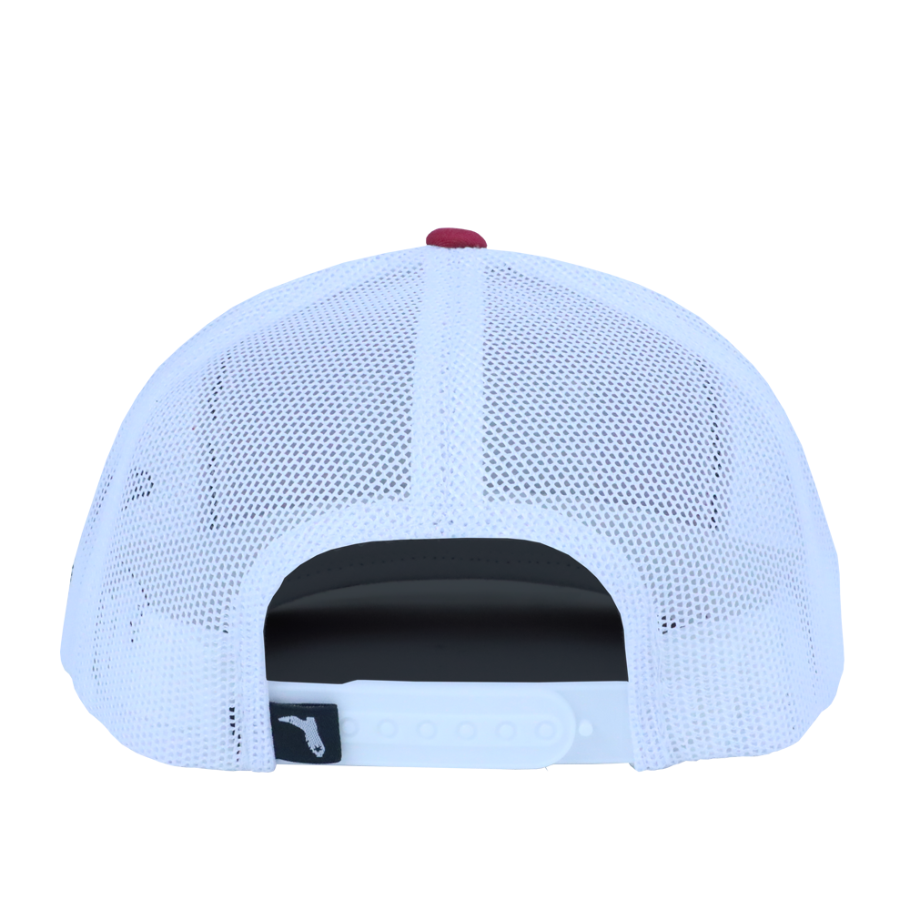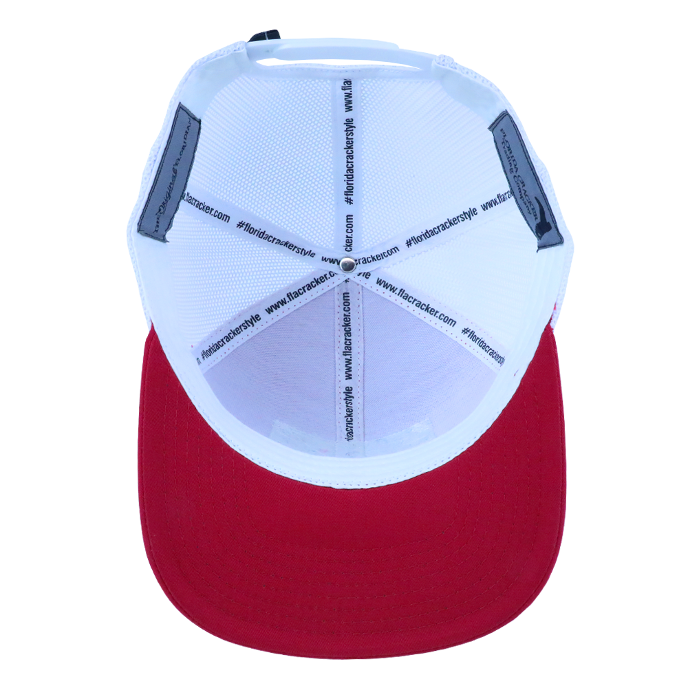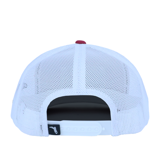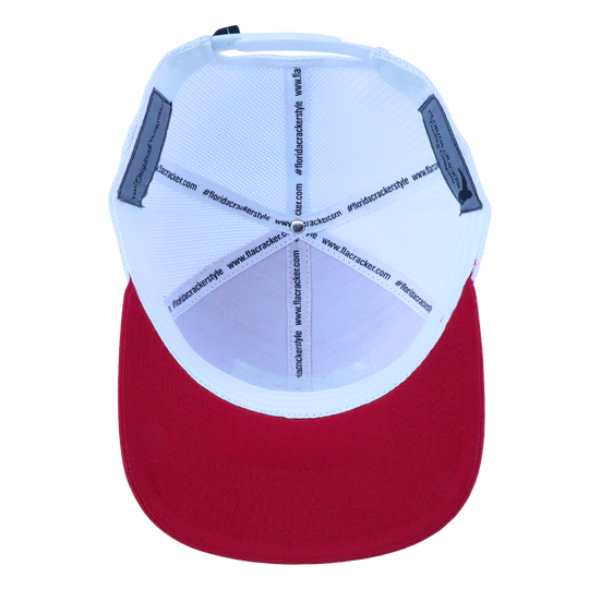 A Cardinal Pacific hat with white mesh, featuring our famous Upside down boot logo on the side, and the traditional state flag patch in the center of the hat.